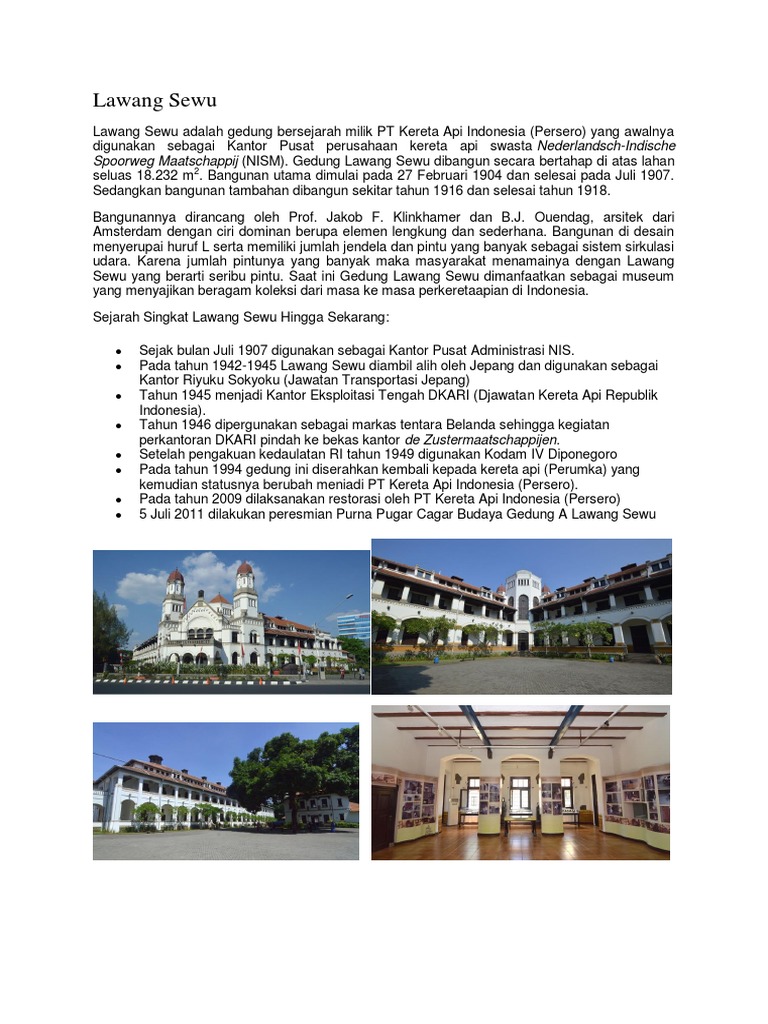 Kawasannya yang mudah dijangkau membuat semua orang tidak ada alasan untuk tidak berkunjung. Lawang sewu adalah salah satu obyek wisata sejarah di semarang, khususnya mengenai sejarah perkeretaapian di indonesia. Lawang sewu semarang adalah bangunan tua yang punya banyak sejarah, lengkap dengan cerita mistisnya. Savesave sejarah lawang sewu for later. 2 months later after retrieval mission, the building is on renovation by the authority.